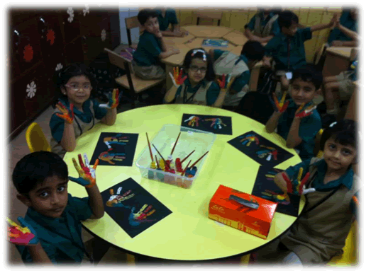 The students of class Preparatory had their Table Mat making activity in the first week of May,2012. The children enjoyed this activity thoroughly as it was their colorful hands which were printed on the mat. The excited giggles and laughter when their hands were being painted could be heard all around. The purpose of this activity was to make a table mat which would useful in the classroom the whole year through after lamination and help the children learn table manners too. |