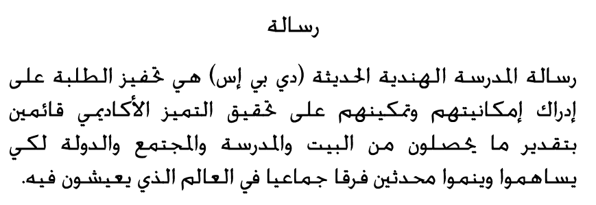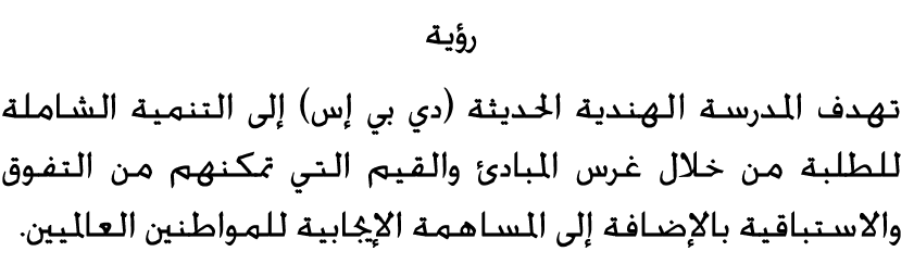 ![]() The mission of DPS Modern Indian School is to motivate students to realize their potential and empower them to achieve academic excellence and make them appreciate what they received from home, school, community and country, so that they contribute and grow, making the collective difference to the world they live in. |