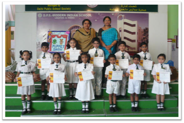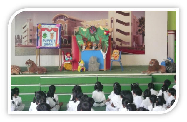 Class 2 teachers entertained their children with a puppet show. A pretty awesome puppet show starring the favourite animals of the jungle. The title of the show was The Blue Fox. The jungle environment was created with beautiful cut outs and charts. Few teachers read the dialogues for the animals while the others operated the puppets behind the screens. The collective effort of the teachers resulted to be very successful. The children expressed their joy and happiness with claps ‘n’ cheers. |